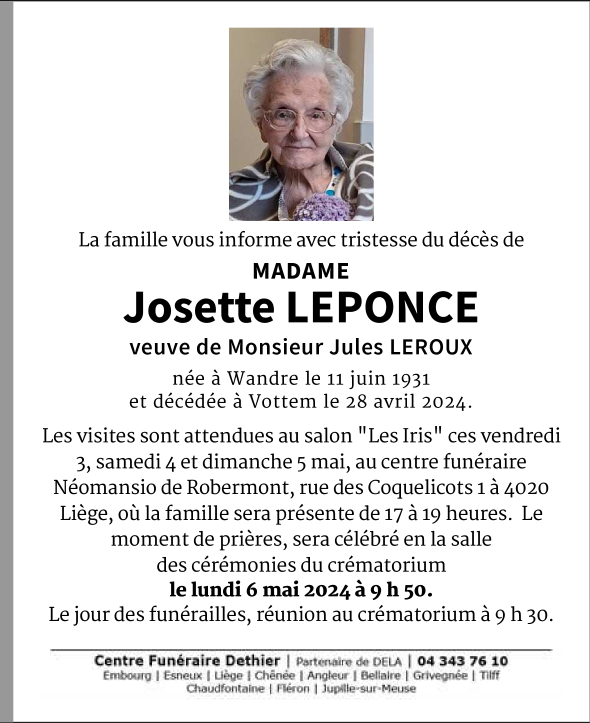Décédée à Vottem (4041) le lundi 29 avril 2024 à l'âge de 92 ans