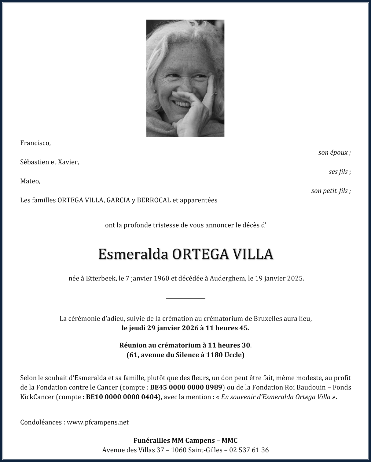Décédée à Auderghem (1160) le lundi 19 janvier 2026 à l'âge de 66 ans