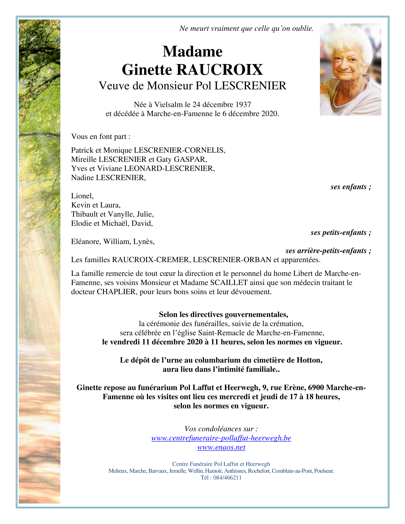 Died in Marche-en-Famenne (6900) on 06 December 2020 at the age of 82 years