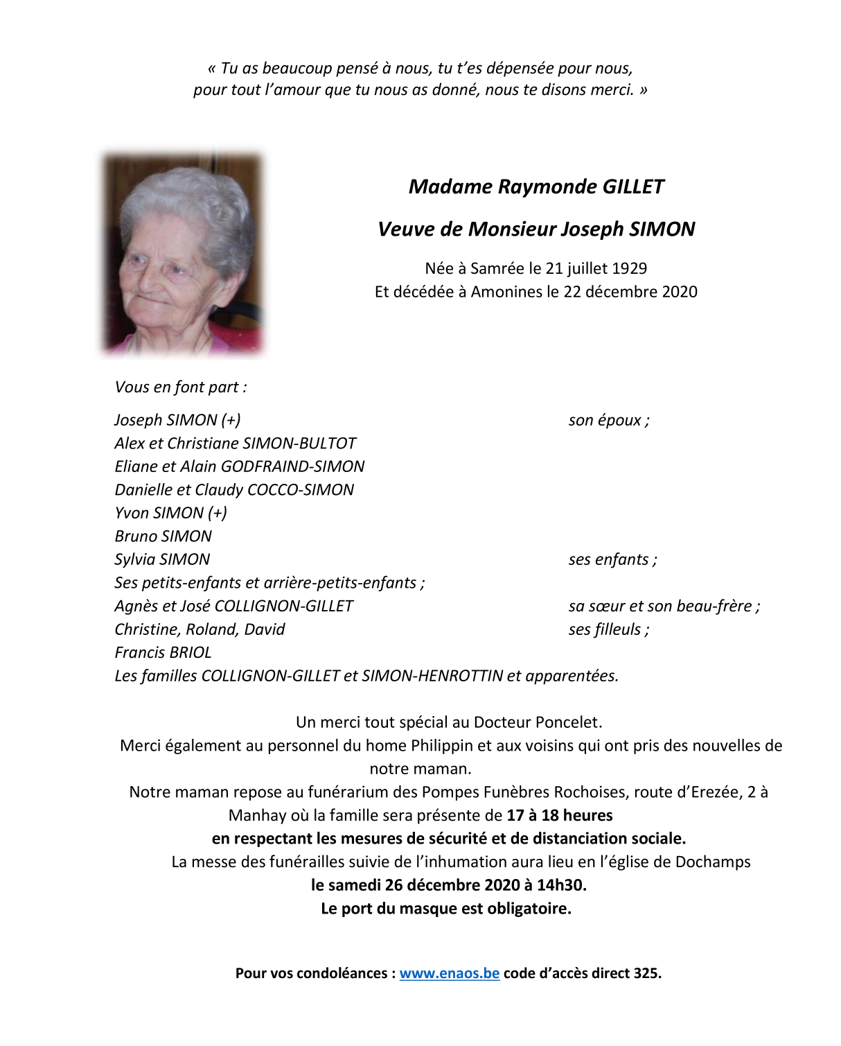 Décédée à Amonines (6997) le mardi 22 décembre 2020 à l'âge de 91 ans