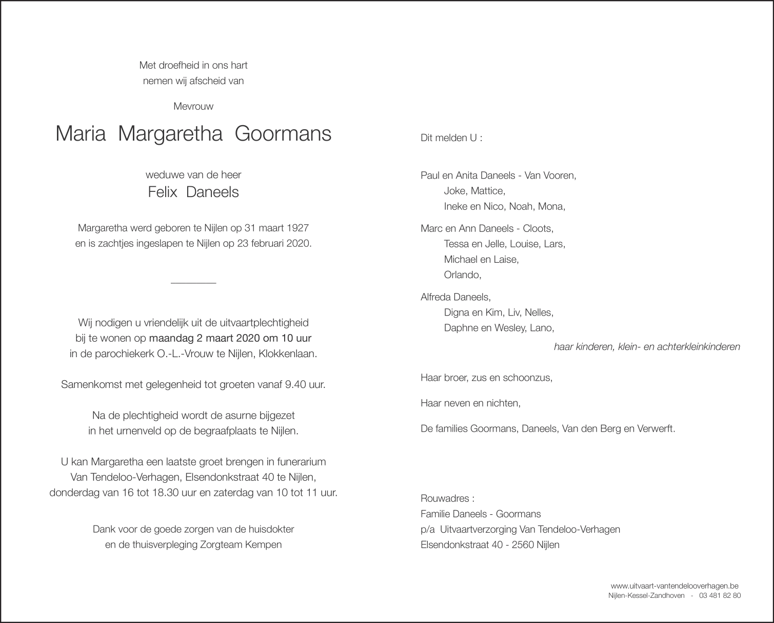 Overleden te Nijlen (2560) op zondag 23 februari 2020 op 92-jarige leeftijd