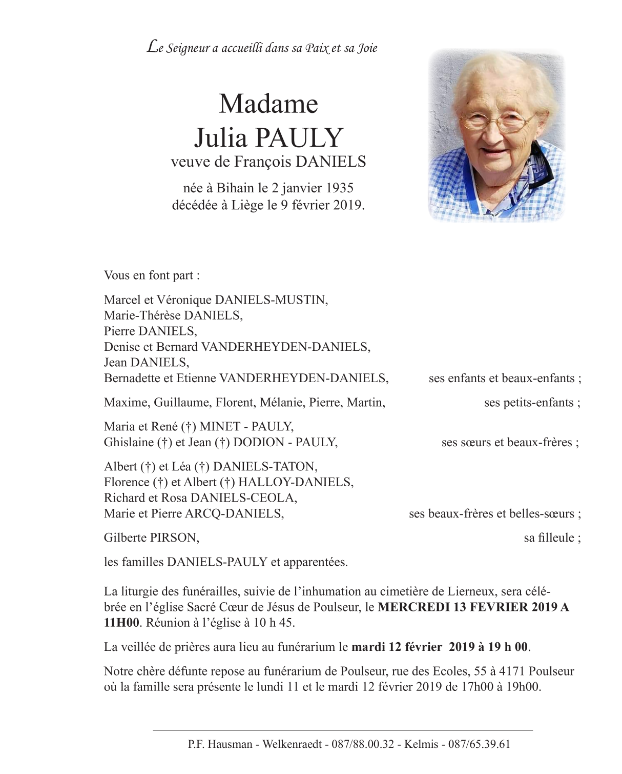 Née à Bihain (6690) le mercredi 2 janvier 1935