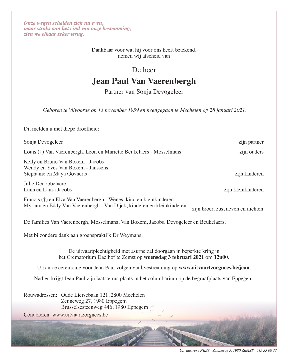 Fallecido en Mechelen (2800) el jueves, 28 de enero de 2021 a la edad de 61 años