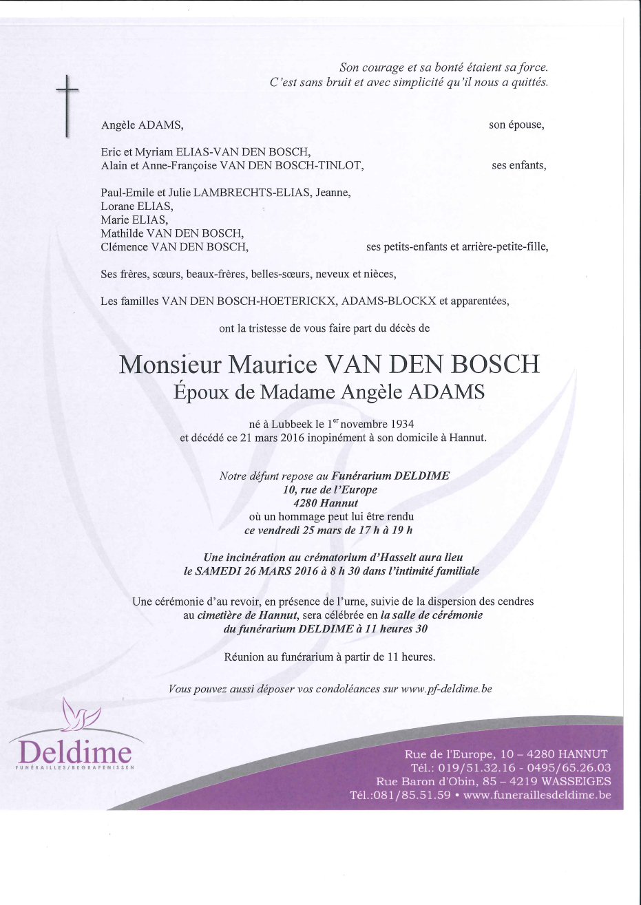 Overleden te Hannut (4280) op maandag 21 maart 2016 op 81-jarige leeftijd