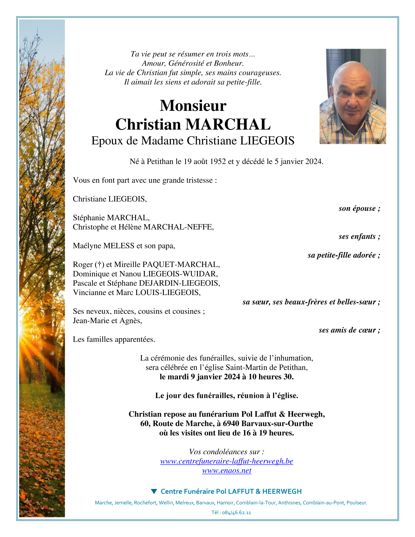 Décédé à Petit-Han (6940) le vendredi 5 janvier 2024 à l'âge de 71 ans