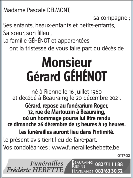 Overleden te Beauraing (5570) op maandag 20 december 2021 op 61-jarige leeftijd