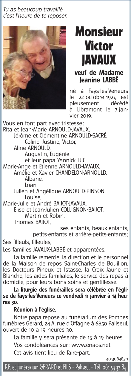 Died in Libramont (6800) on 07 January 2019 at the age of 91 years