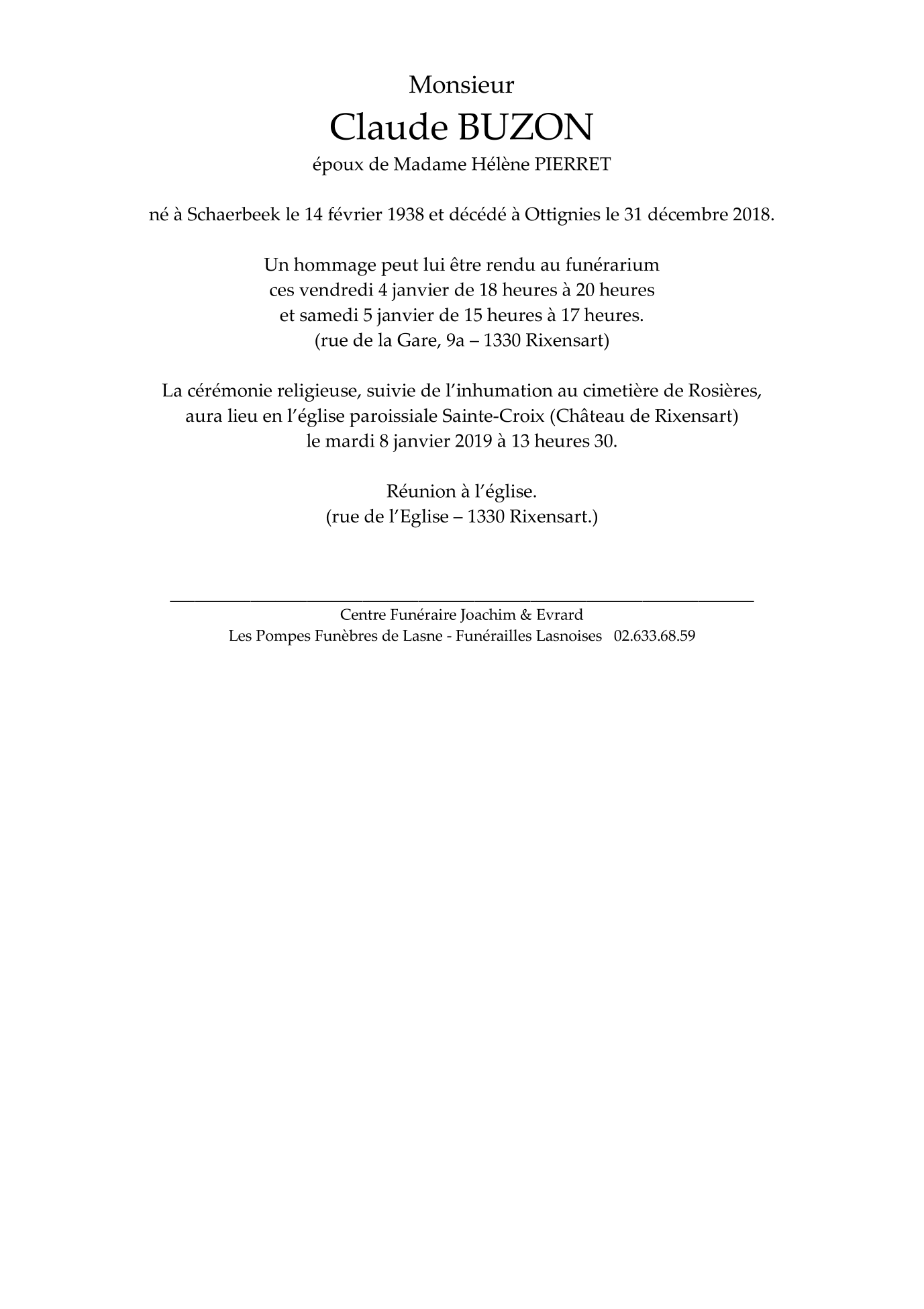 Décédé à Ottignies (1340) le lundi 31 décembre 2018 à l'âge de 80 ans