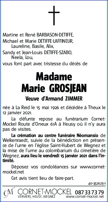 Overleden te Theux (4910) op dinsdag 12 januari 2021 op 94-jarige leeftijd