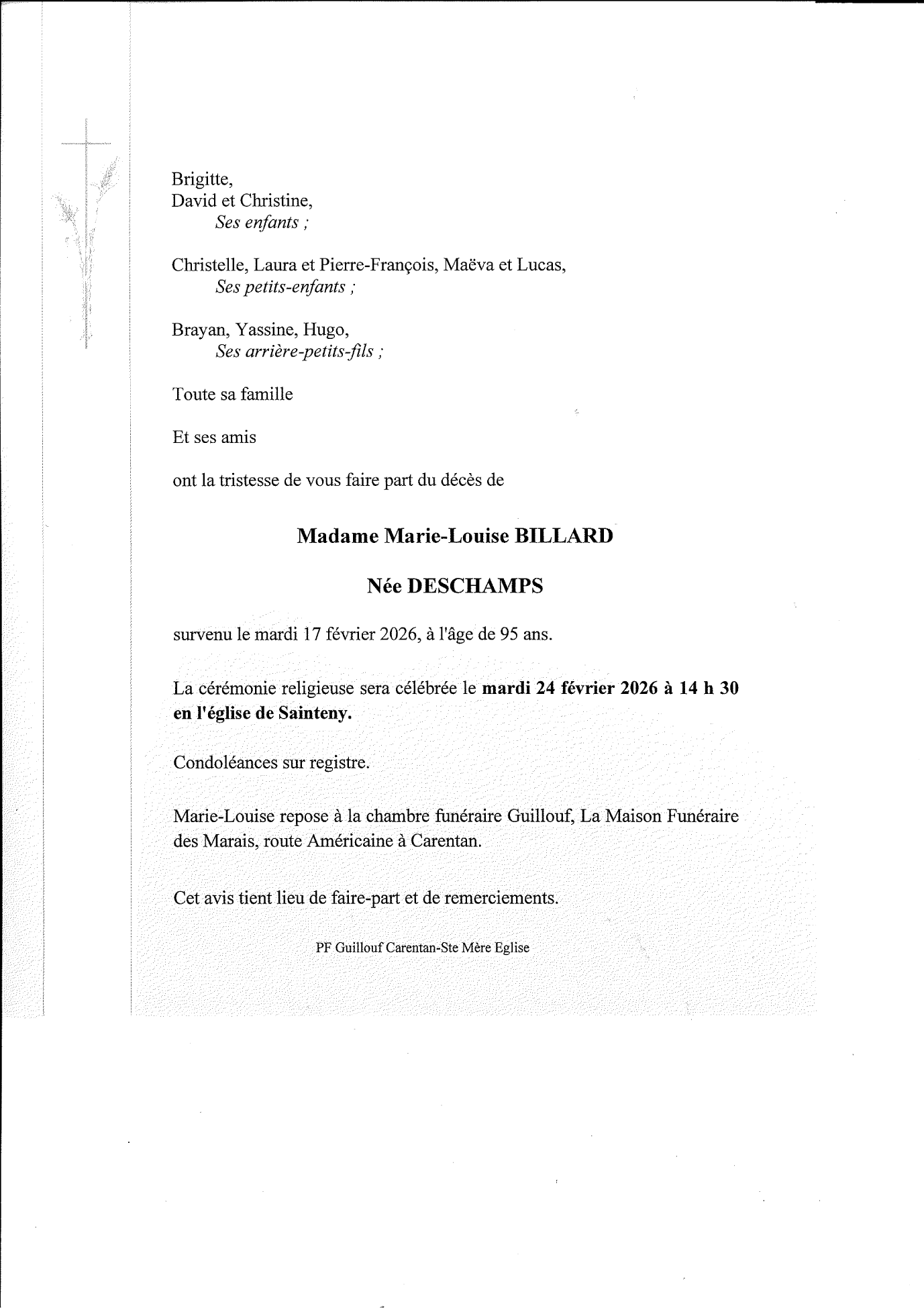 Veuve de Monsieur Bernard BILLARD