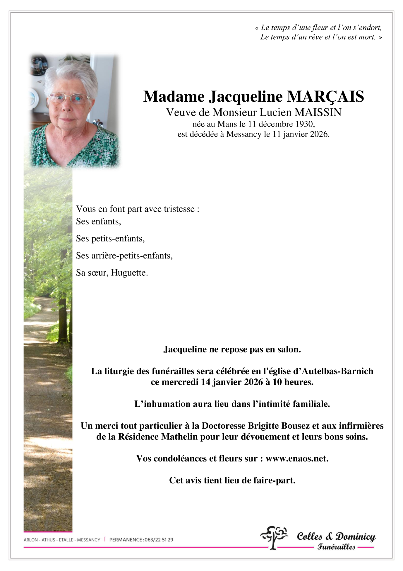 Décédée à Messancy (6780) le dimanche 11 janvier 2026 à l'âge de 95 ans
