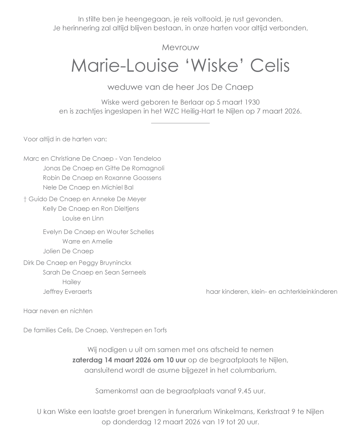 Décédée à Nijlen (2560) le samedi 7 mars 2026 à l'âge de 96 ans