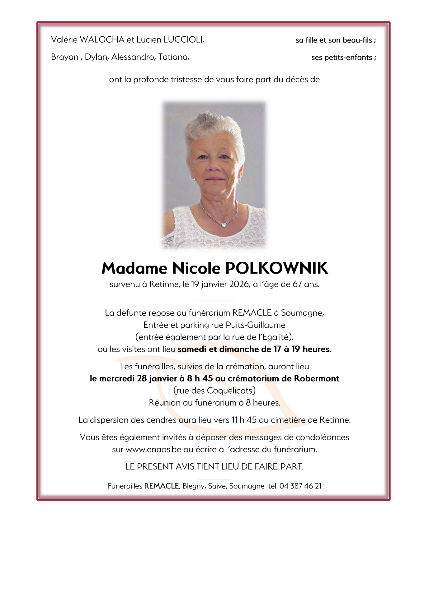 Décédée à Retinne (4621) le lundi 19 janvier 2026 à l'âge de 67 ans