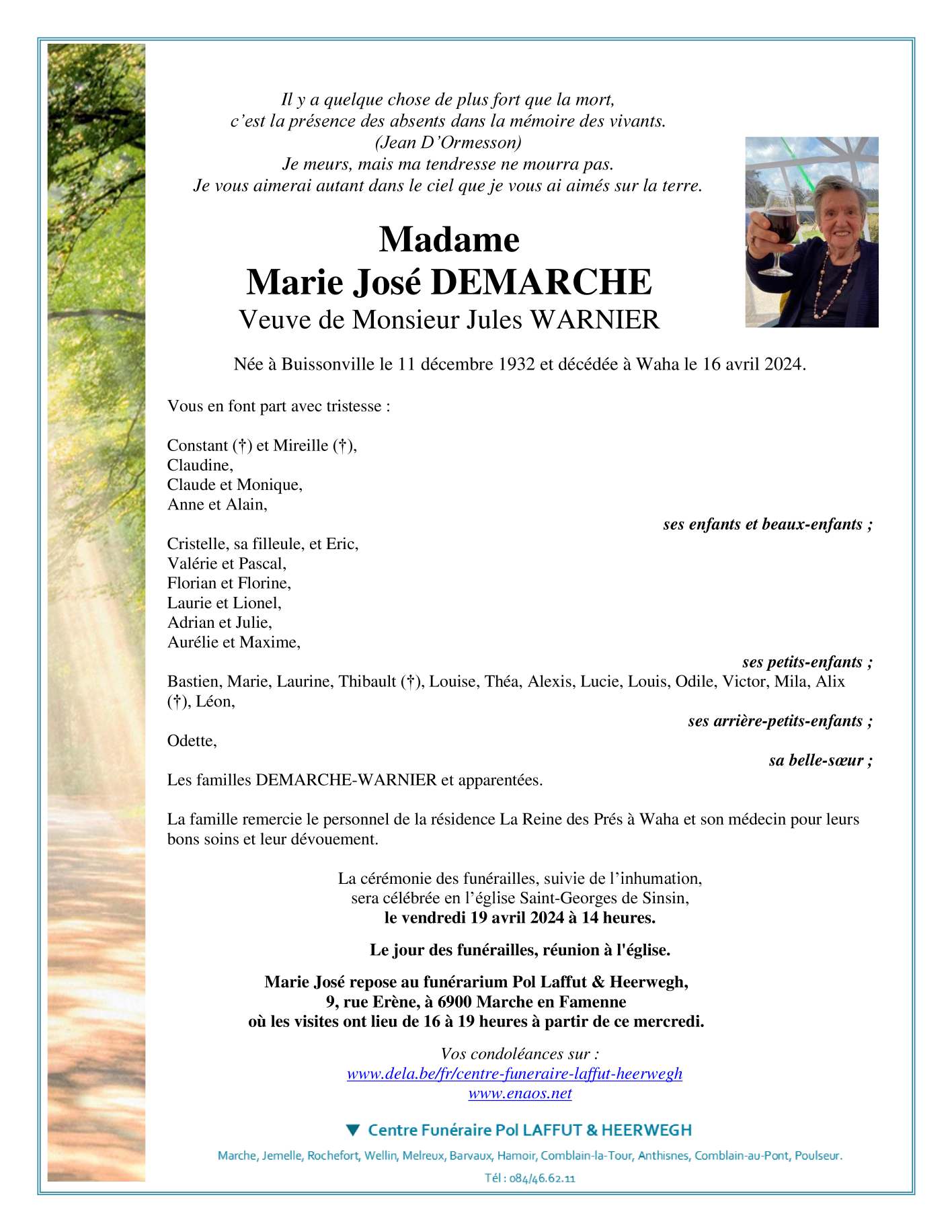 Décédée à Waha (6900) le mardi 16 avril 2024 à l'âge de 91 ans