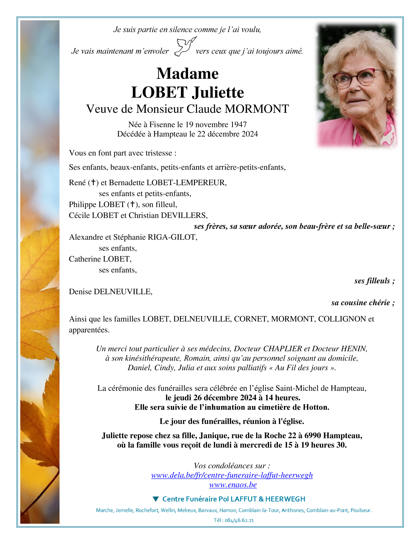 Décédée à Hampteau (6990) le dimanche 22 décembre 2024 à l'âge de 77 ans