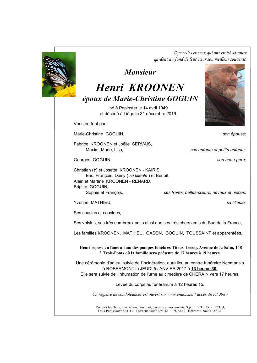Overleden te Liège (4000) op zaterdag 31 december 2016 op 67-jarige leeftijd