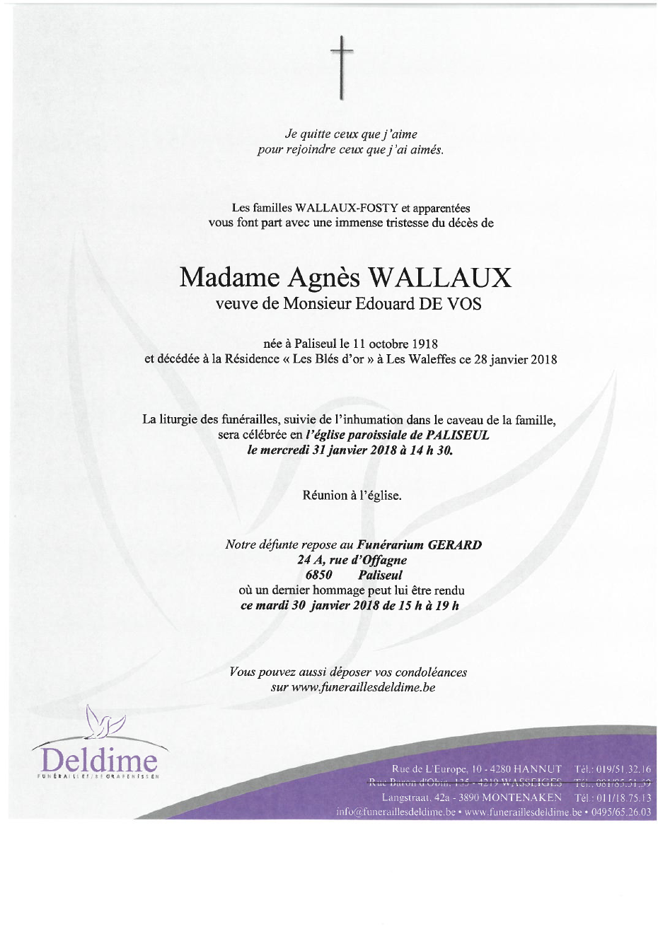 Décédée à Les Waleffes (4317) le dimanche 28 janvier 2018 à l'âge de 99 ans