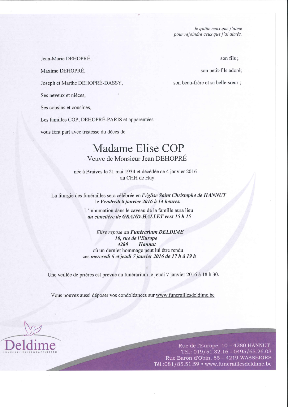 Fallecida en Huy (4500) el lunes, 4 de enero de 2016 a la edad de 81 años