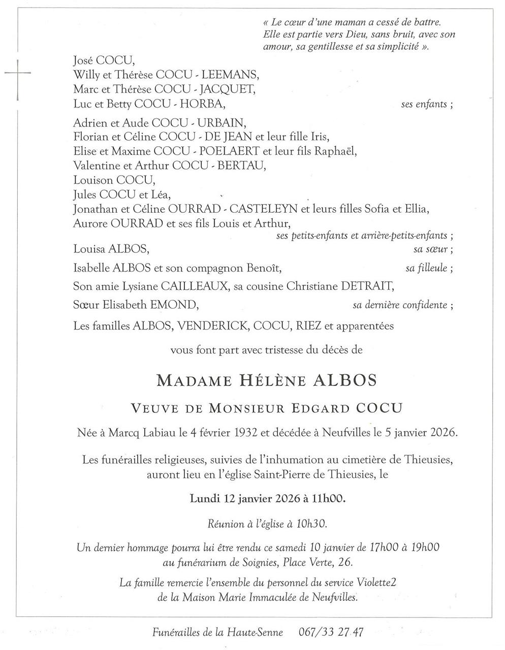 Décédée à Neufvilles (7063) le lundi 5 janvier 2026 à l'âge de 93 ans
