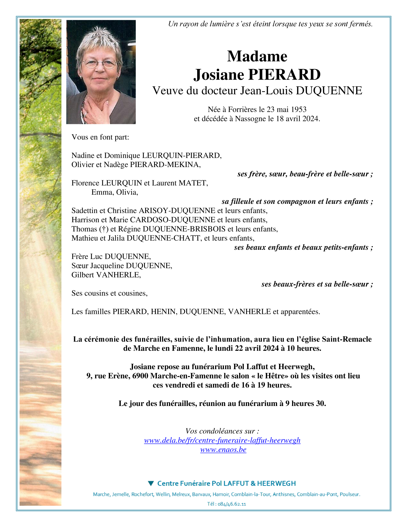 Fallecida en Nassogne (6950) el jueves, 18 de abril de 2024 a la edad de 70 años