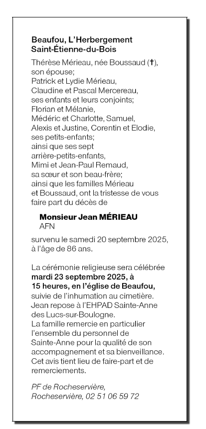 Overleden te Les Lucs-sur-Boulogne (85170, Frankrijk) op zaterdag 20 september 2025 op 86-jarige leeftijd