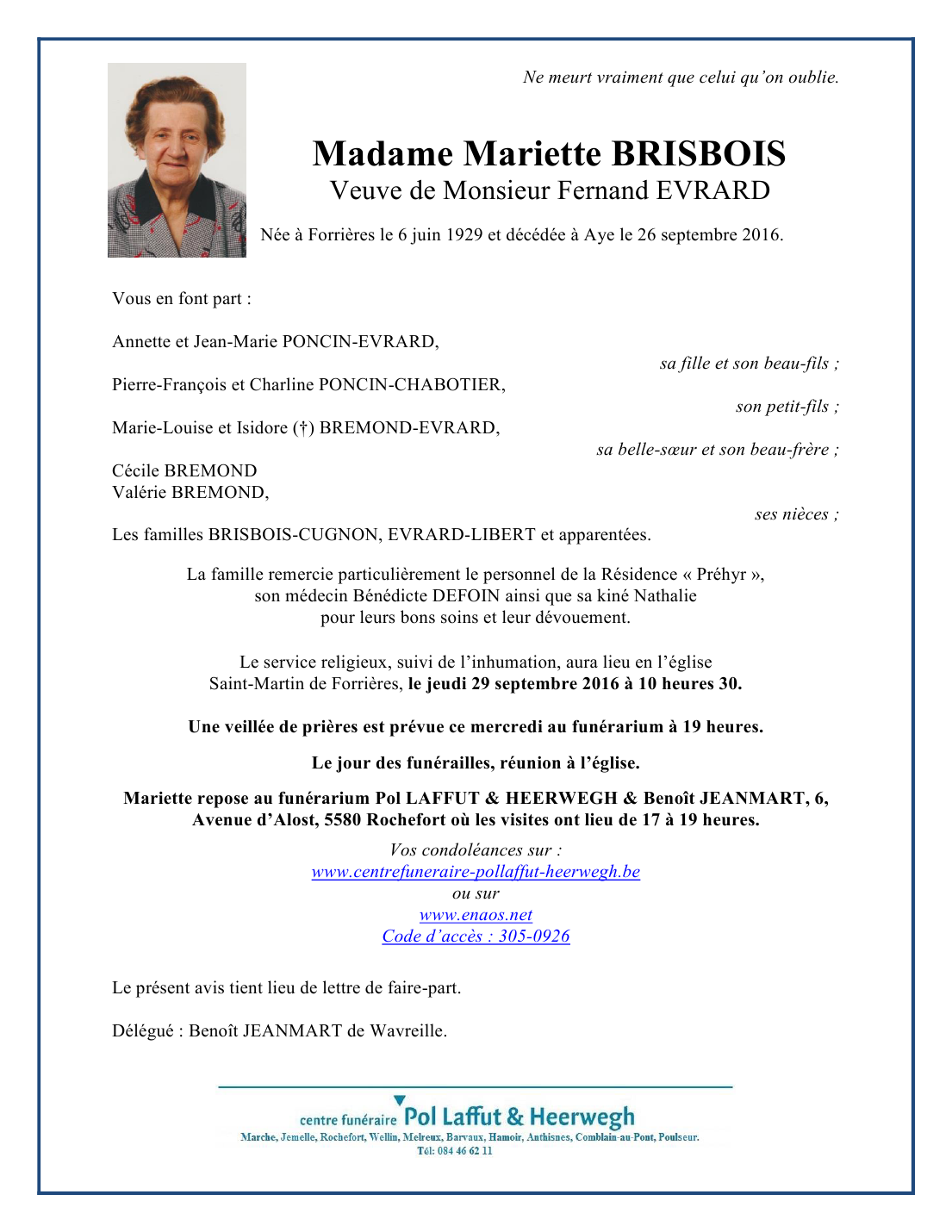 Overleden te Aye (6900) op maandag 26 september 2016 op 87-jarige leeftijd