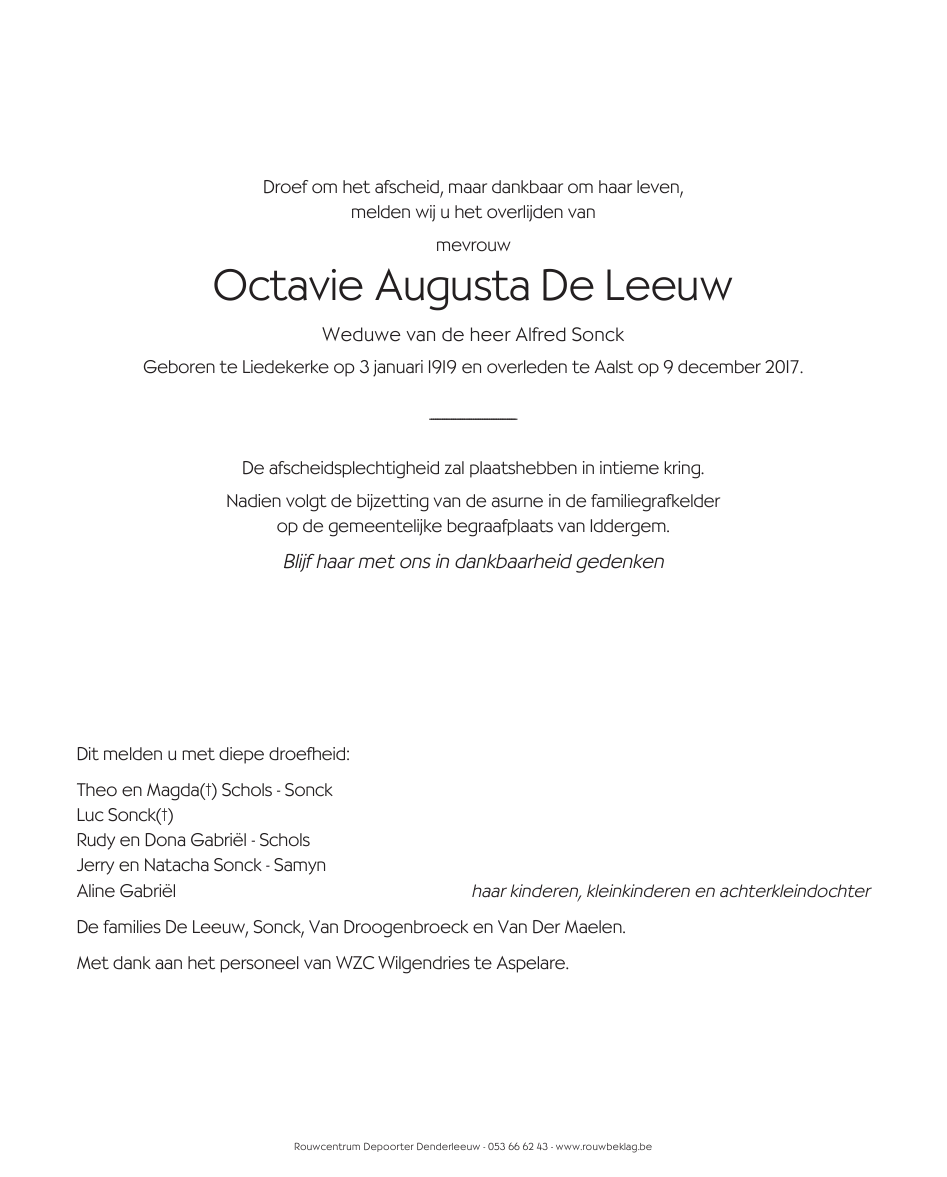 Died in Aalst (9300) on 09 December 2017 at the age of 98 years