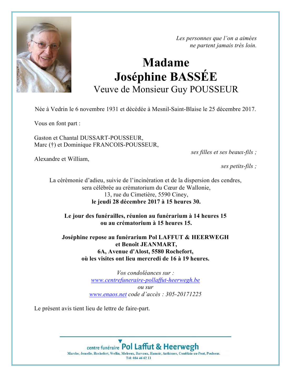 Décédée à Mesnil-Saint-Blaise (5560) le lundi 25 décembre 2017 à l'âge de 86 ans