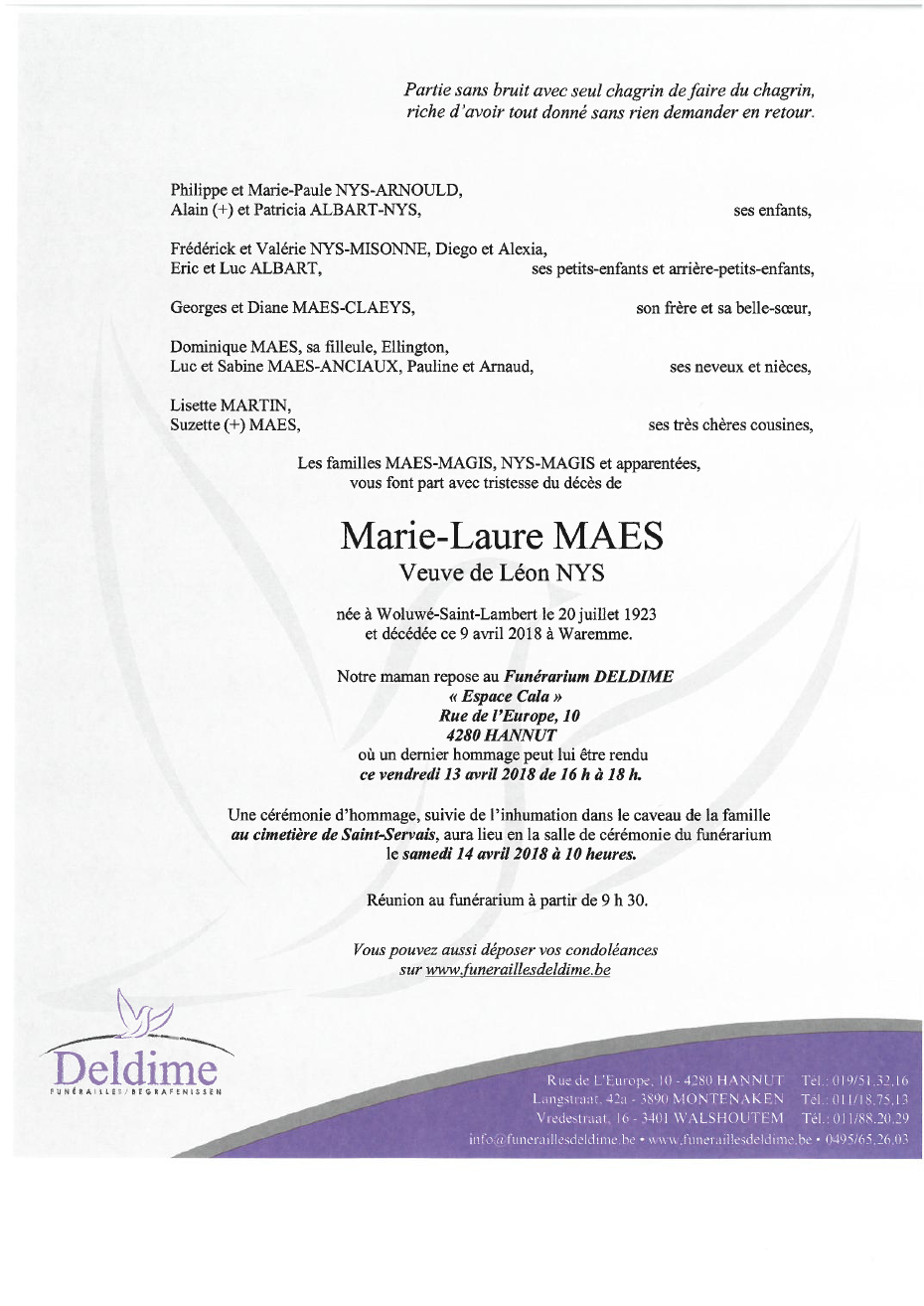 Overleden te Waremme (4300) op maandag 9 april 2018 op 94-jarige leeftijd