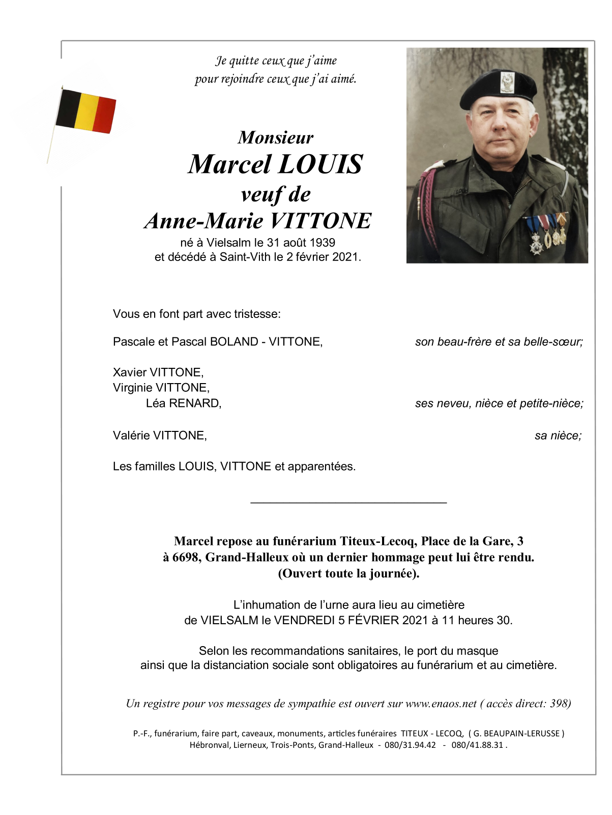 Décédé à Saint-Vith (4780) le mardi 2 février 2021 à l'âge de 81 ans