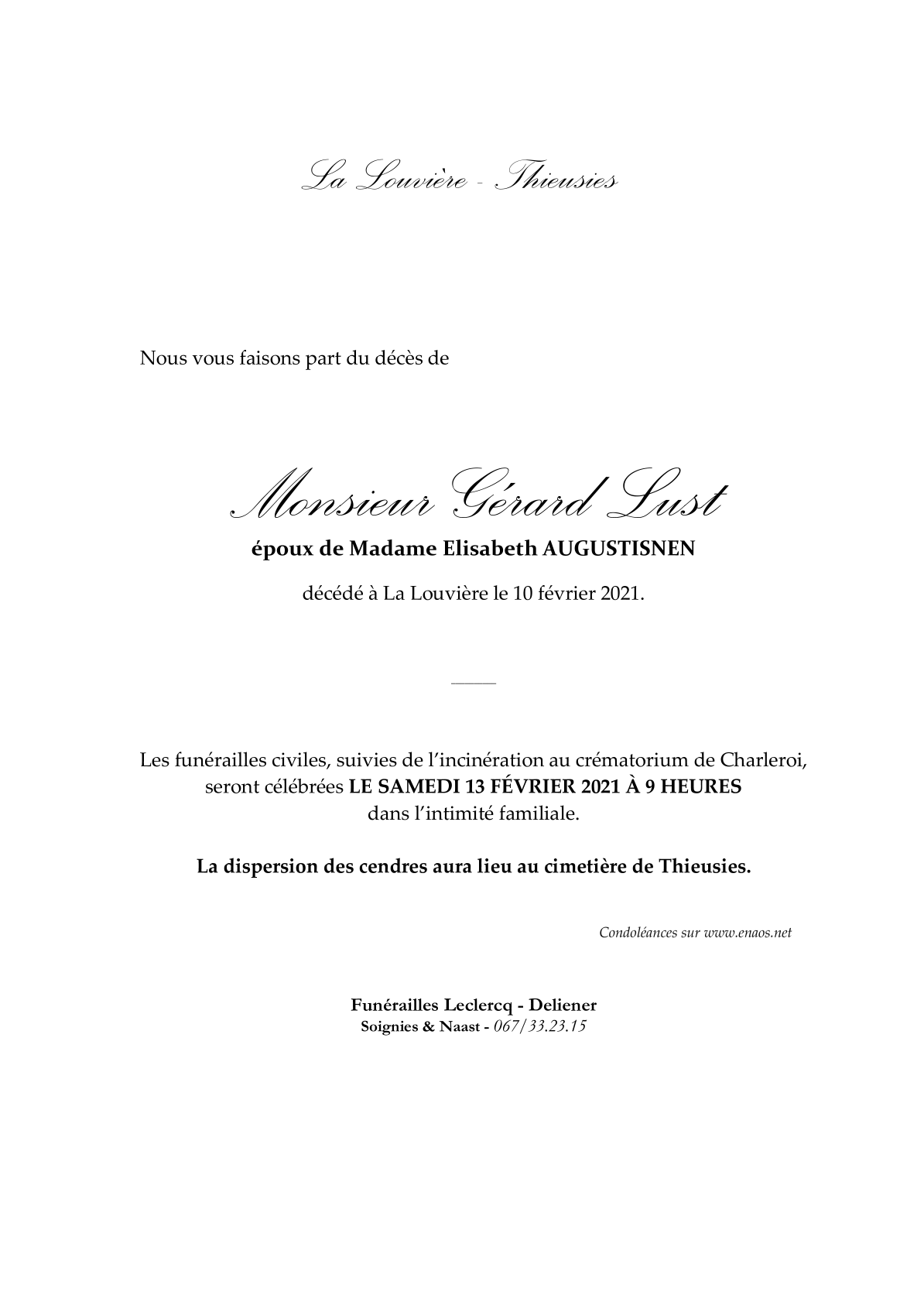 Died in La Louvière (7100) on 10 February 2021 at the age of 87 years