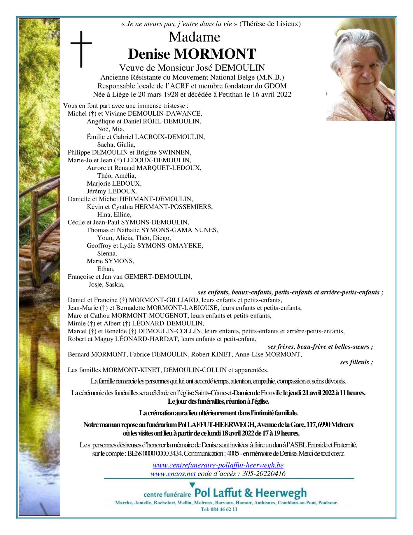 Died in Durbuy (6940) on 16 April 2022 at the age of 94 years