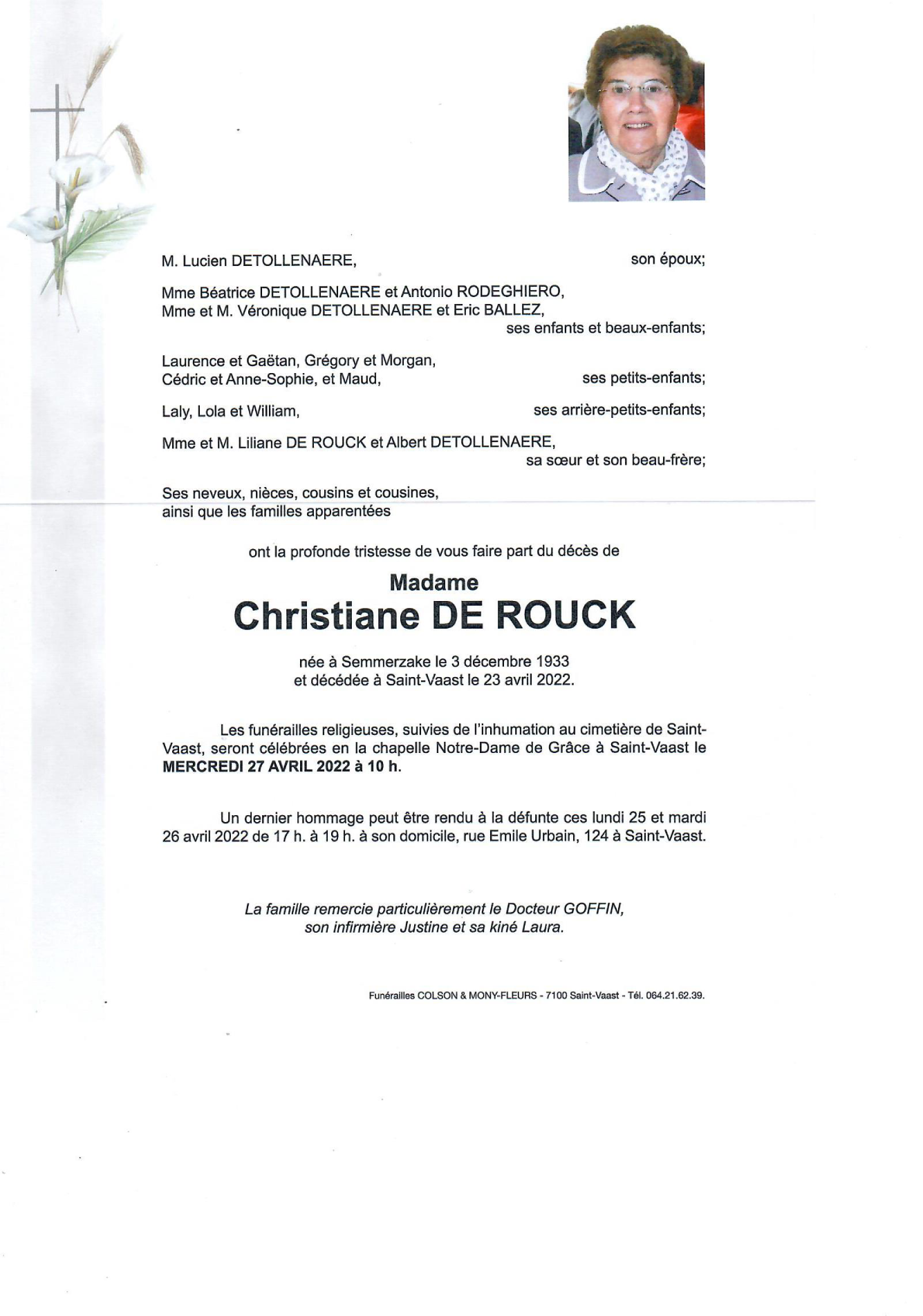 Epouse de Monsieur Lucien DETOLLENAERE