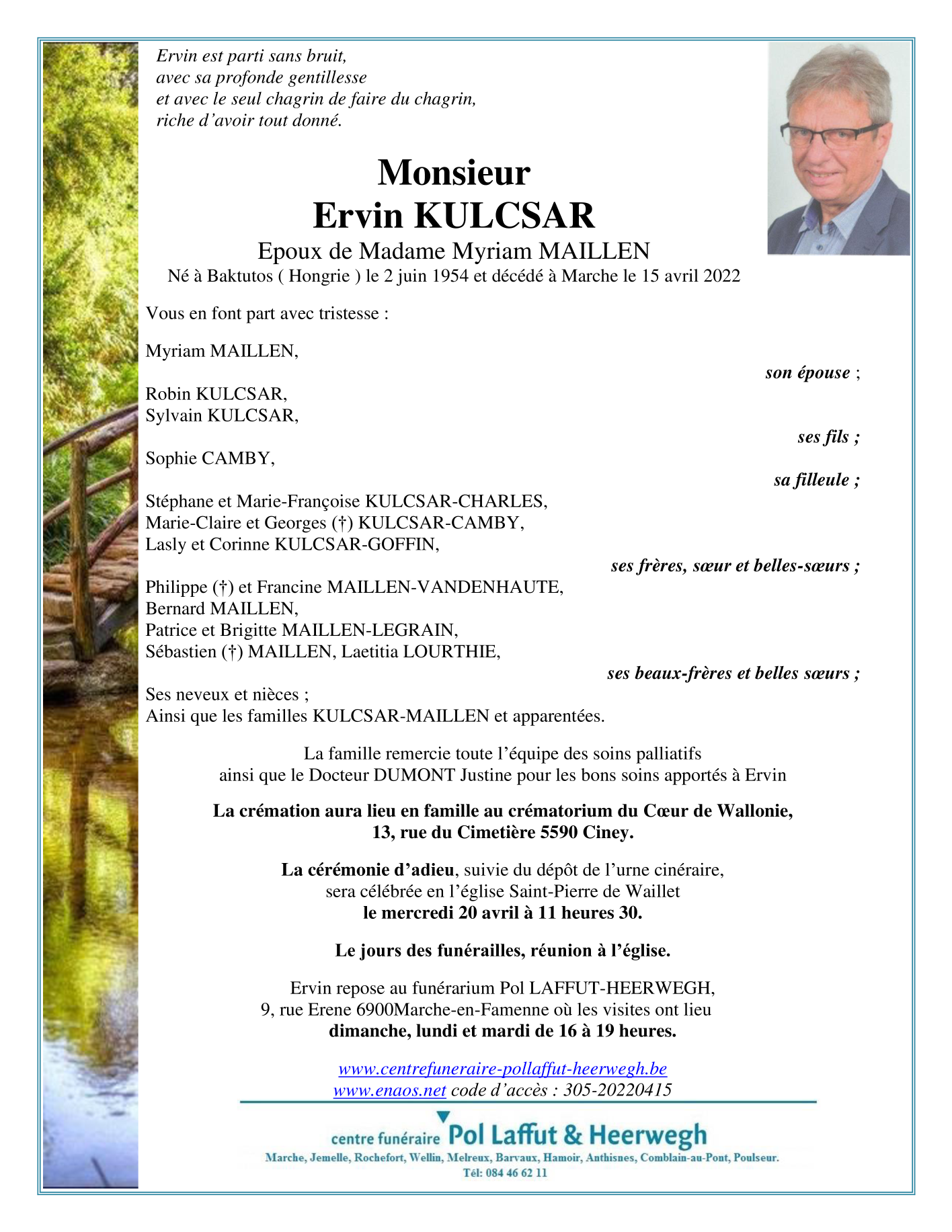 Décédé à Marche-en-Famenne (6900) le vendredi 15 avril 2022 à l'âge de 67 ans