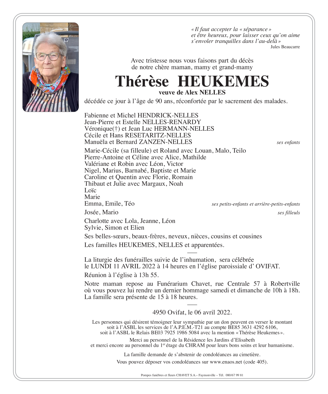 Died in Malmedy (4960) on 06 April 2022 at the age of 90 years