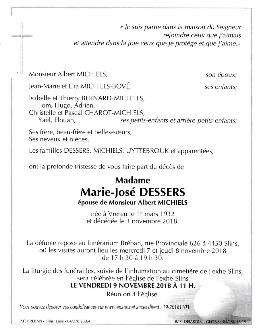 Madame Marie-José DESSERS épouse d'Albert MICHIELS