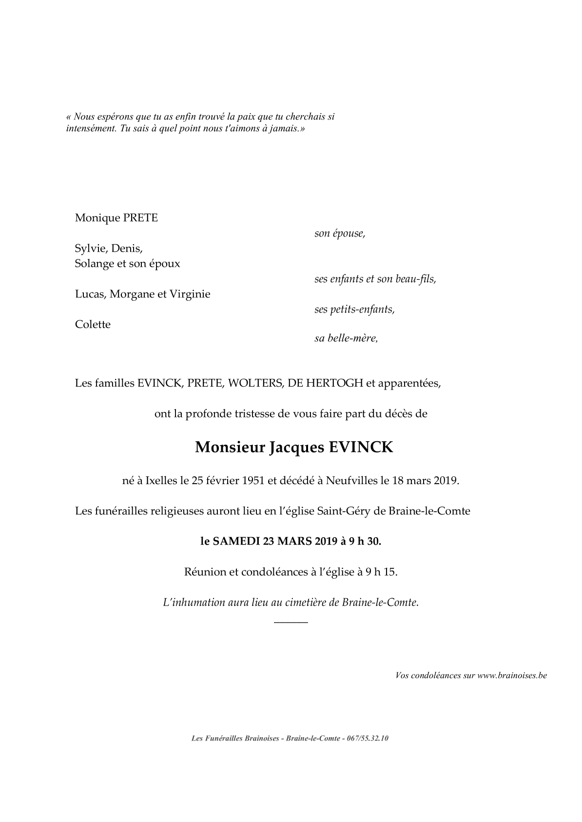Décédé à Neufvilles (7063) le lundi 18 mars 2019 à l'âge de 68 ans