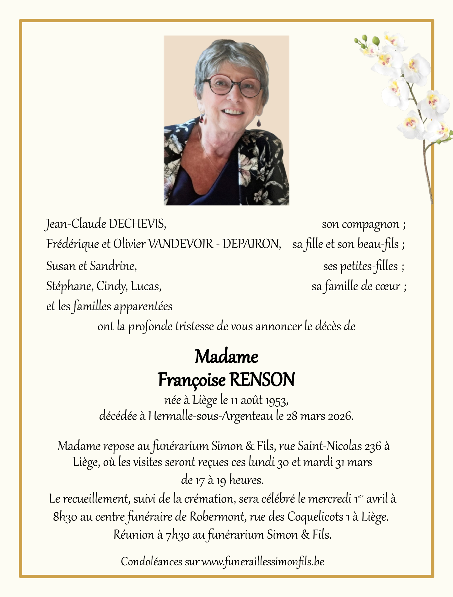 Décédée à Hermalle-sous-Argenteau (4681) le samedi 28 mars 2026 à l'âge de 72 ans