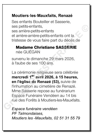 Overleden te Moutiers-les-Mauxfaits (85540, Frankrijk) op zondag 29 maart 2026 op 99-jarige leeftijd