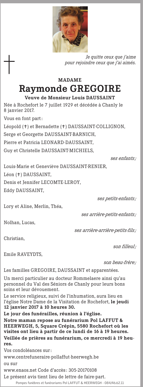 Décédée à Chanly (6921) le dimanche 8 janvier 2017 à l'âge de 87 ans