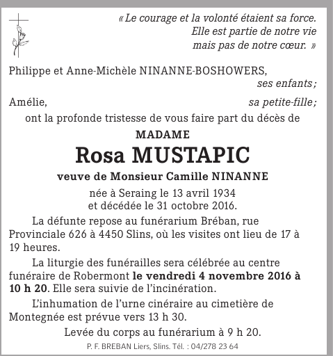 Madame Rosa MUSTAPIC veuve de Camille NINANNE