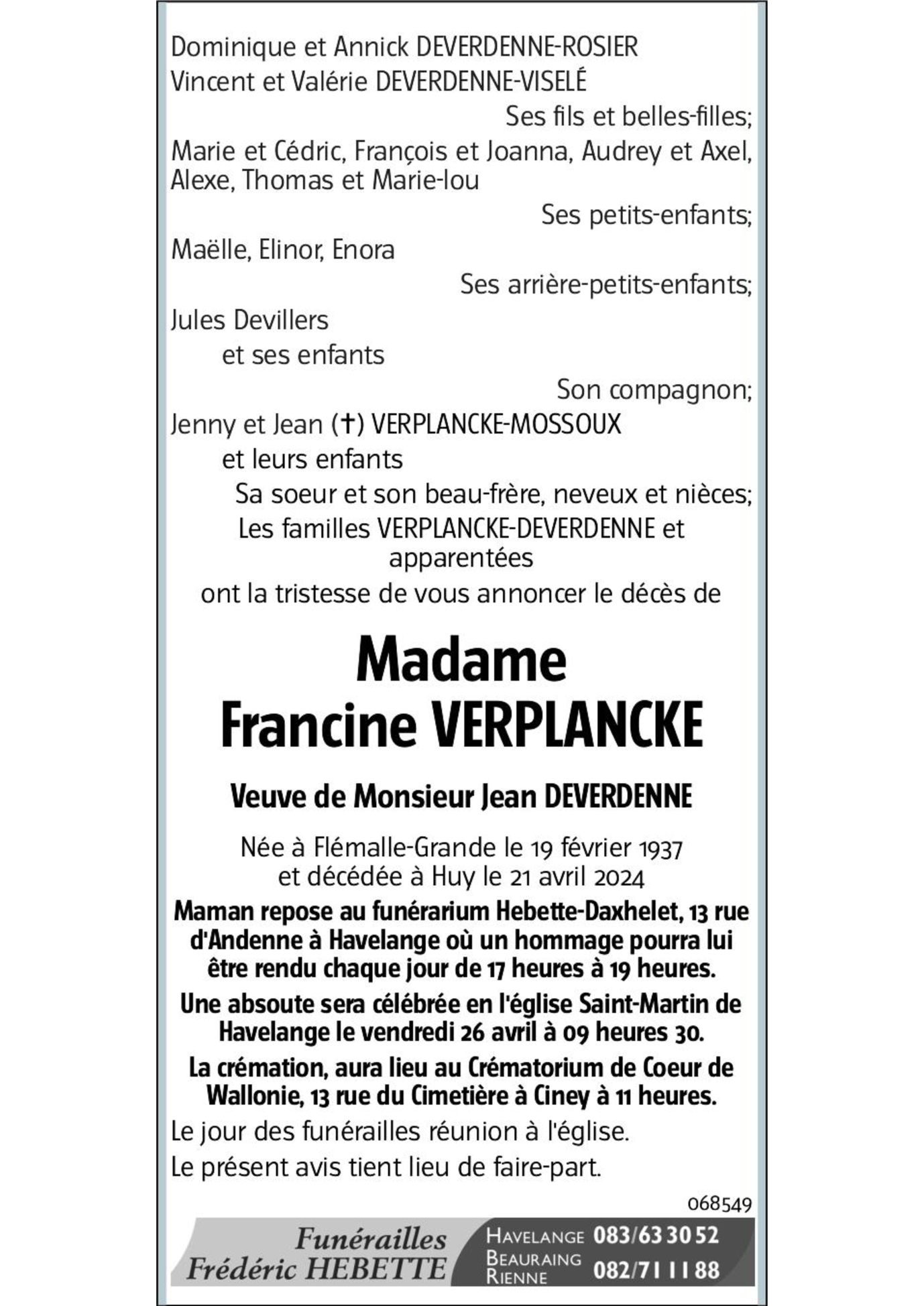 Madame Francine VERPLANCKE