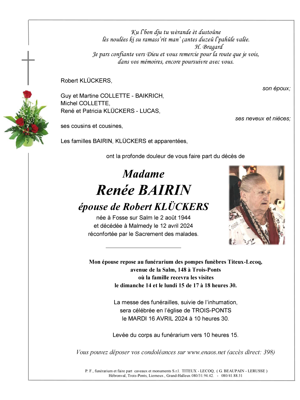 Died in Malmedy (4960) on 12 April 2024 at the age of 79 years