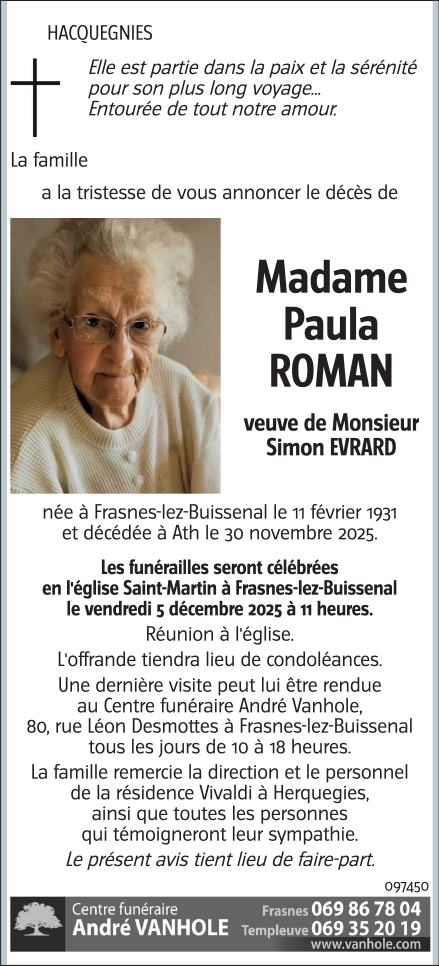 Overleden te Ath (7800) op zondag 30 november 2025 op 94-jarige leeftijd