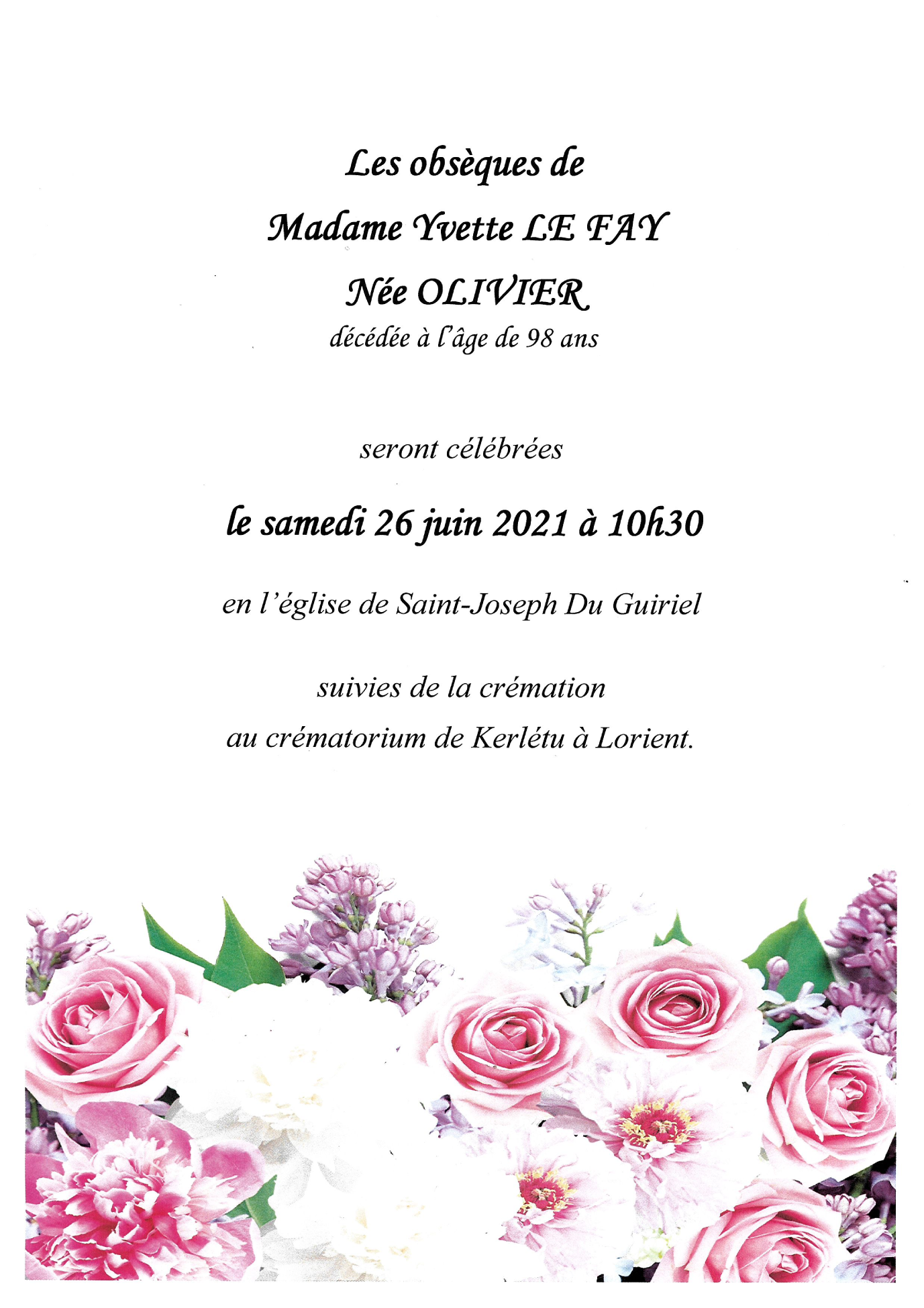 Fallecida en Hennebont (56700, Francia) el martes, 22 de junio de 2021 a la edad de 98 años