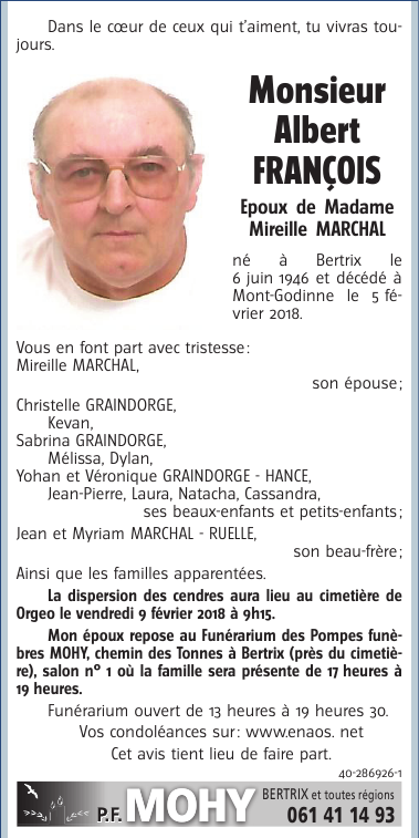 Décédé à Mont-Godinne (5530) le lundi 5 février 2018 à l'âge de 71 ans