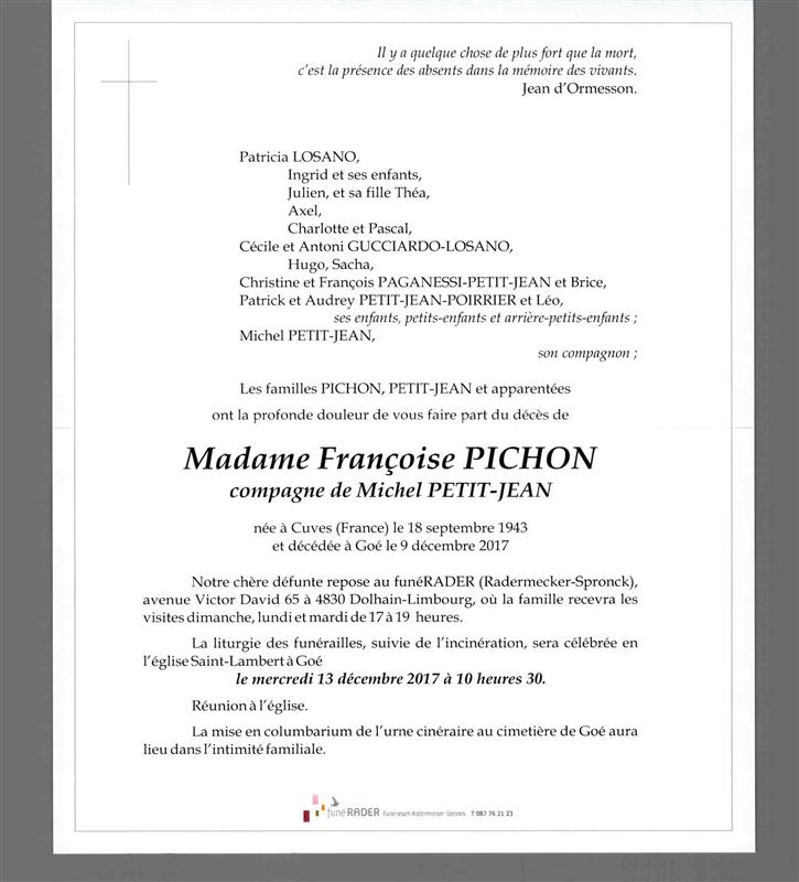 Décédée à Goé (4834) le samedi 9 décembre 2017 à l'âge de 74 ans