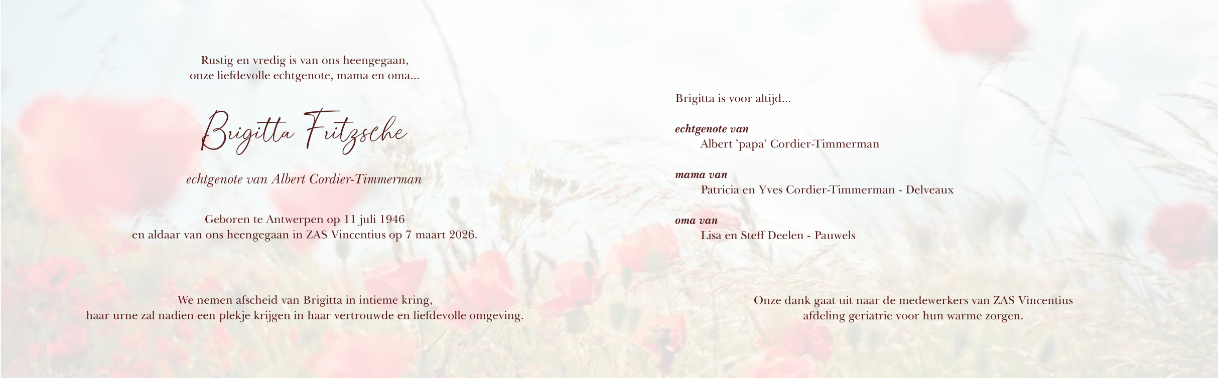 Fallecida en Antwerpen (2018) el sábado, 7 de marzo de 2026 a la edad de 79 años