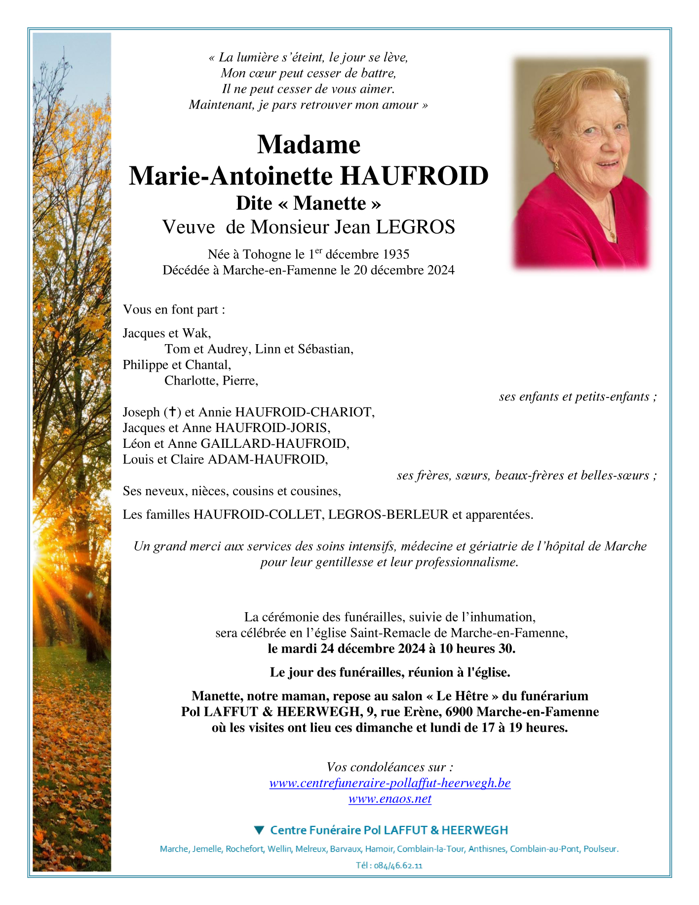 Fallecida en Marche-en-Famenne (6900) el viernes, 20 de diciembre de 2024 a la edad de 89 años