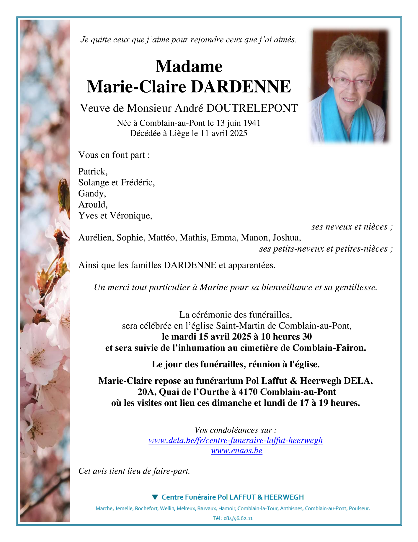 Died in Liège (4000) on 11 April 2025 at the age of 83 years